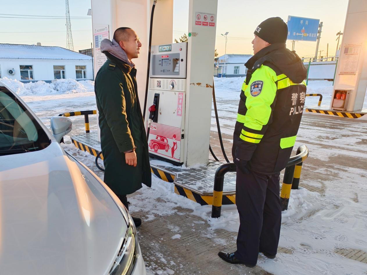 簡單確認(rèn)情況后,民輔警立即攜帶救援物資,前往事發(fā)地點,在最短時間內(nèi)找到報警人。在詢問車內(nèi)油量大約能達(dá)到最近的加油站后,警車引領(lǐng)報警人駕駛車輛抵達(dá)最近的加油站,加滿油后囑咐駕駛員雪天路滑,注意行駛速度,切勿疲勞駕駛。