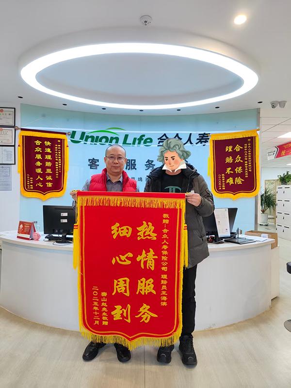 2026年1月5日,Z先生的兒子特意來(lái)到中支柜面,親手送來(lái)一面感謝的錦旗,書(shū)寫(xiě)“熱情服務(wù) 細(xì)心周到”以此表達(dá)他們深深的謝意。錦旗上熠熠生輝的字句,不僅是對(duì)理賠人員專業(yè)服務(wù)的高度認(rèn)可,更是對(duì)合眾人壽溫暖關(guān)懷的由衷贊譽(yù),彰顯了合眾人壽在客戶心中樹(shù)立的良好形象以及雙方之間深厚的信任與情誼。