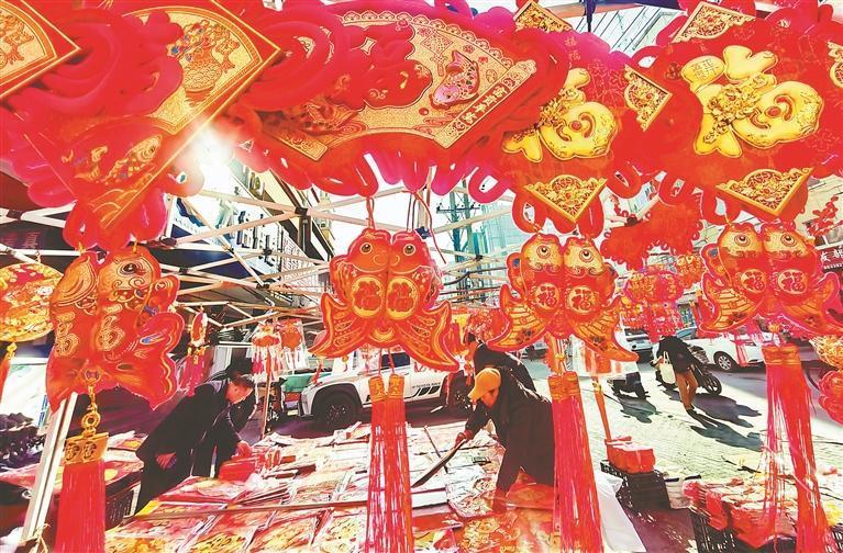 13日,哈爾濱市道外區(qū)大水晶街附近的集市上,許多市民在購買年貨。集市上,各種商品琳瑯滿目,應(yīng)有盡有。紅燈籠、“?!弊帧β?lián)烘托出濃濃的喜慶氣氛。人們臉上都洋溢著幸福的笑容,個(gè)個(gè)滿載而歸。