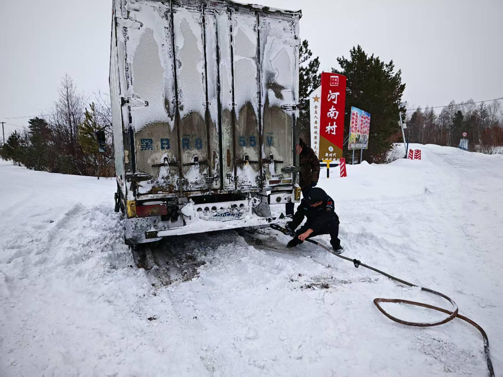 交警大隊(duì)接到G331國(guó)道河口執(zhí)勤點(diǎn)求助稱有一輛廂式貨車因積雪過(guò)厚、路面濕滑、不慎陷于深雪中無(wú)法移動(dòng),導(dǎo)致車輛被困。