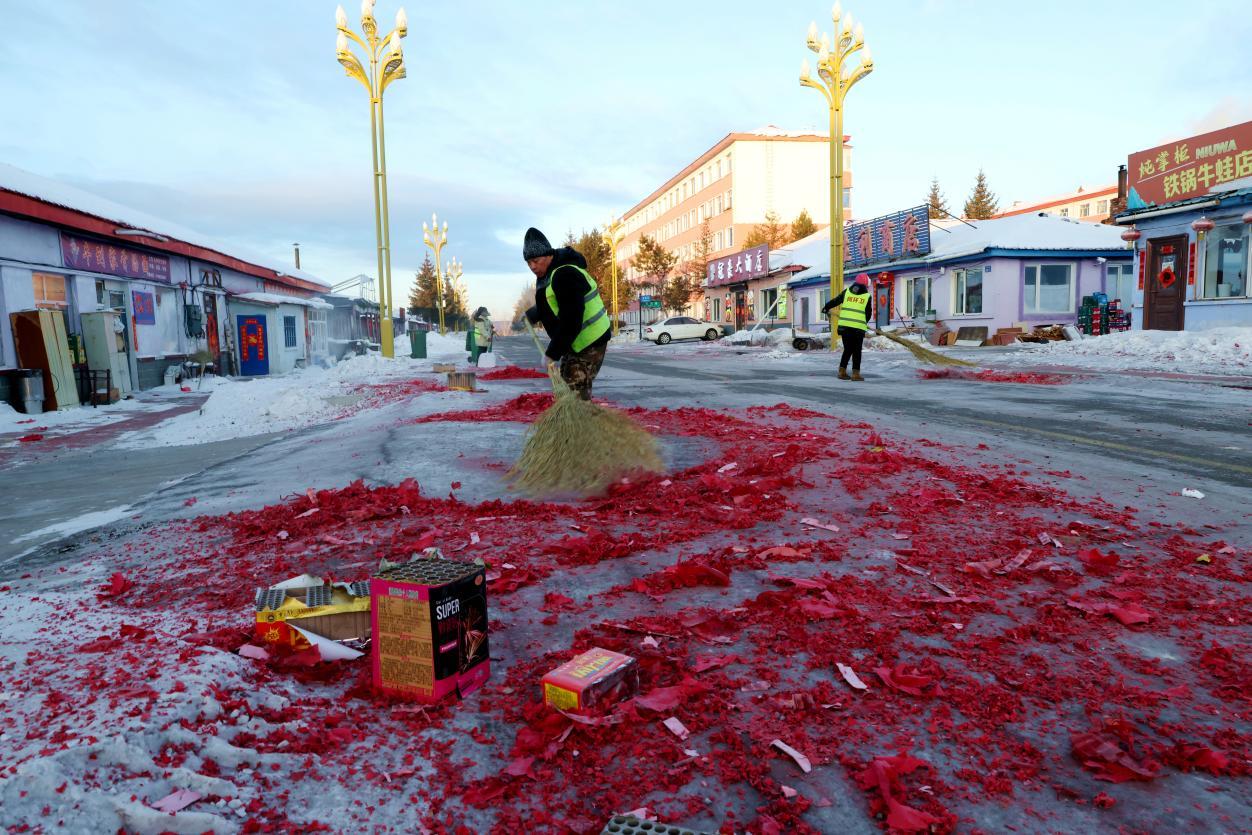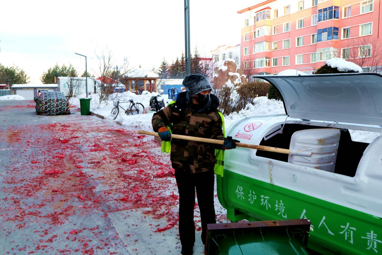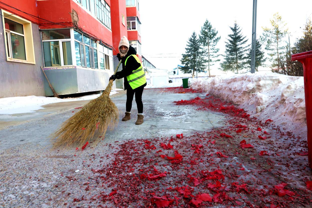 2月16日8點(diǎn),大街小巷年味正濃,鞭炮紙屑散落各處,行人寥寥。身穿黃馬甲的林業(yè)局環(huán)衛(wèi)工人已穿梭在街頭,帽子、睫毛凝滿白霜,手中掃帚不停揮舞,將鞭炮碎屑、生活垃圾及時(shí)清掃歸堆、裝車清運(yùn)。轉(zhuǎn)崗環(huán)衛(wèi)工人馬建民說:“我的責(zé)任區(qū)內(nèi)商戶多、居民多,春節(jié)期間工作量比平時(shí)多一倍,必須打掃干凈,讓大家過個(gè)舒心年。”在全體保潔員的奮戰(zhàn)下,居民區(qū)實(shí)現(xiàn)鞭炮紙屑隨放隨清、生活垃圾日產(chǎn)日清,大街小巷始終整潔有序。