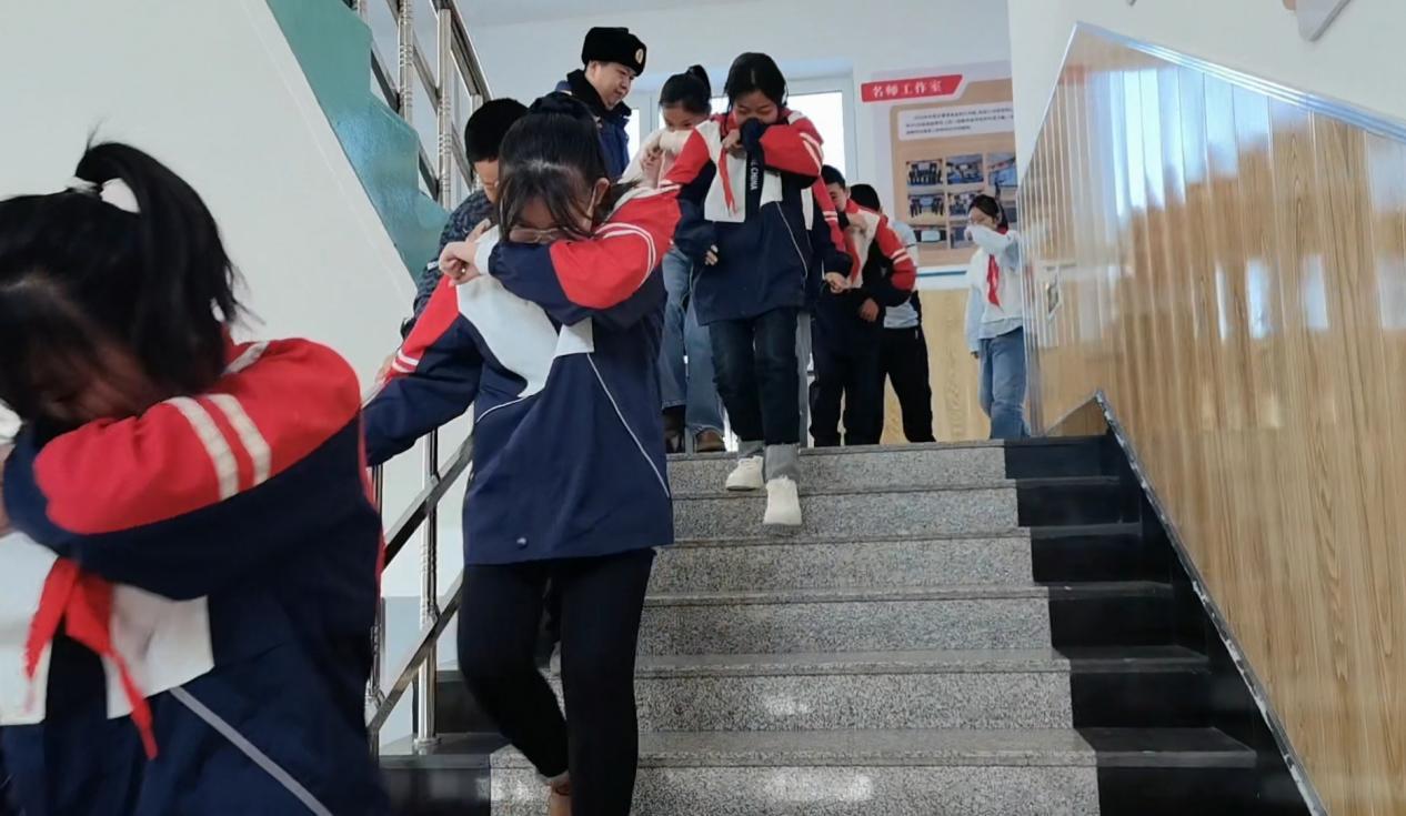 學(xué)生們?cè)谙佬麄鲉T與班主任的指引下有序開展應(yīng)急疏散演練(胡春磊 攝)