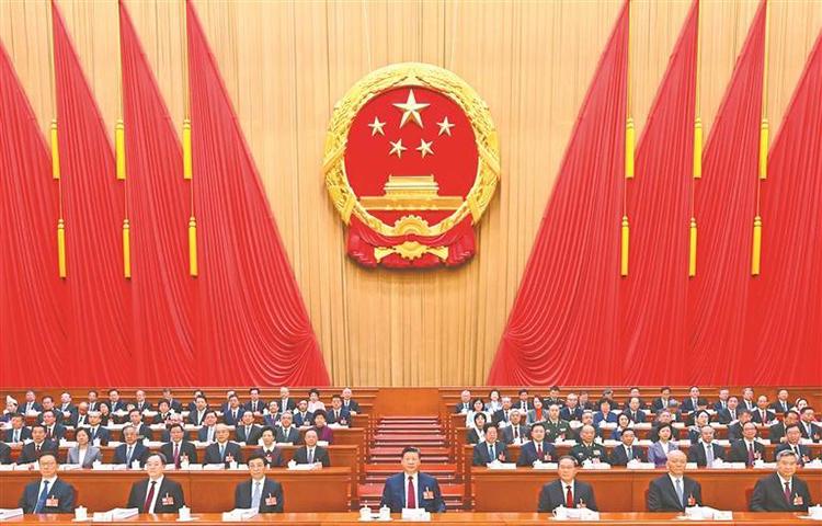 人民大會堂萬人大禮堂氣氛莊重?zé)崃?,主席臺帷幕正中的國徽在鮮艷的紅旗映襯下熠熠生輝。