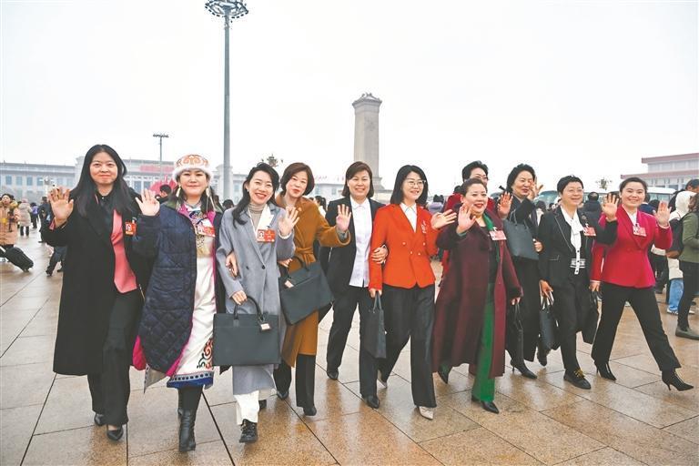 全國(guó)兩會(huì)期間,參加十四屆全國(guó)人大四次會(huì)議的黑龍江女代表意氣風(fēng)發(fā)步入會(huì)場(chǎng)。