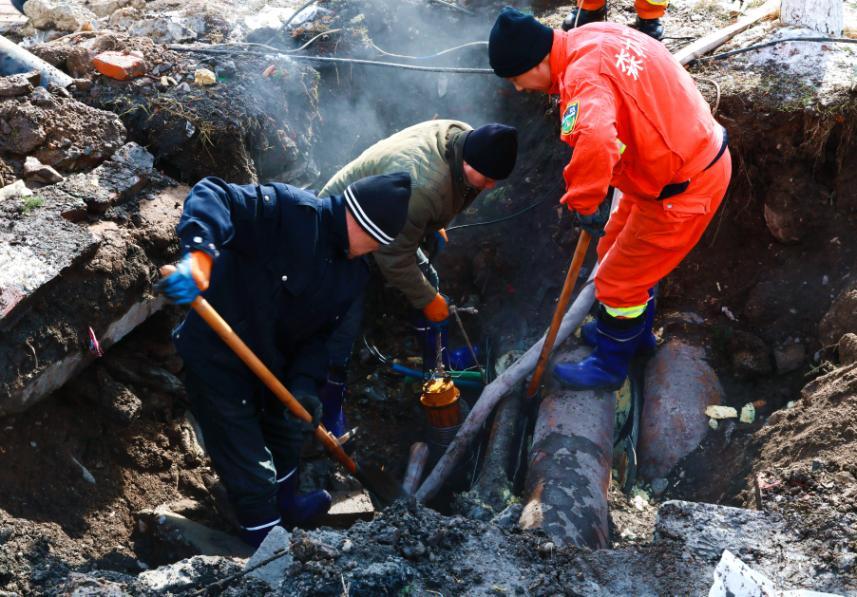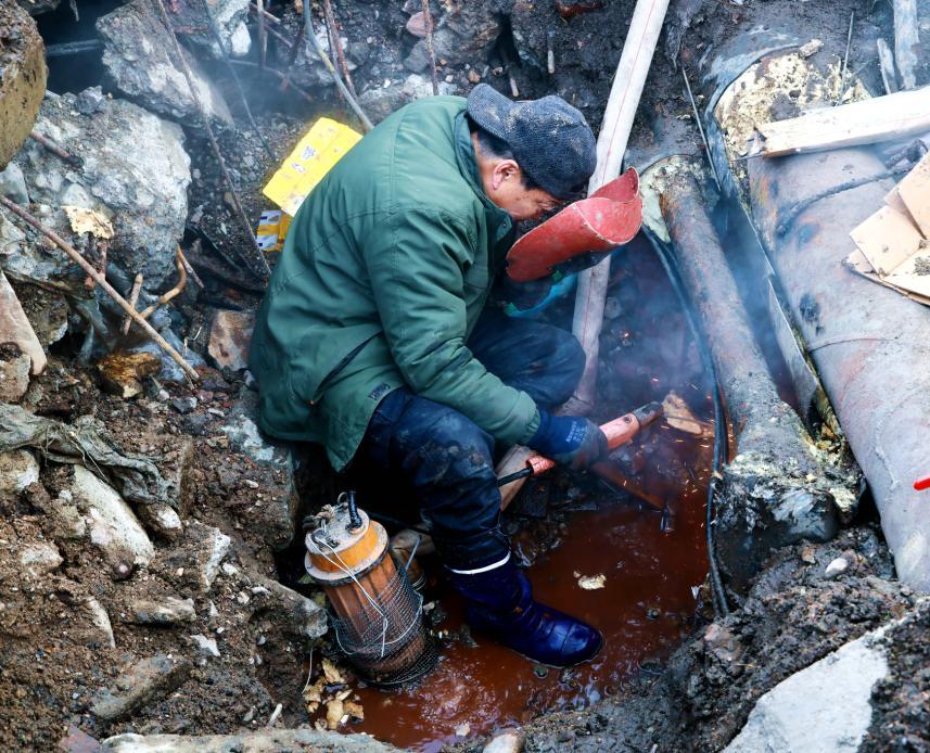 搶修現(xiàn)場,機械與人力協(xié)同發(fā)力。小型挖掘機破土作業(yè),挖開近2米深的作業(yè)面,精準(zhǔn)定位蒙板漏水點。10余名搶修人員腳穿水靴,一邊操作水泵排水,一邊用鍬鎬擴大作業(yè)空間,爭分奪秒推進(jìn)搶修進(jìn)程。為搶抓進(jìn)度,搶修人員放棄午休和周日休息,全程堅守一線,先后完成開口、安裝臨時閥門等關(guān)鍵工序,待供暖主管水凈后,迅速開展焊接作業(yè),精準(zhǔn)修復(fù)10多公分長的破裂處,最終完成焊接、保溫及現(xiàn)場恢復(fù)工作。